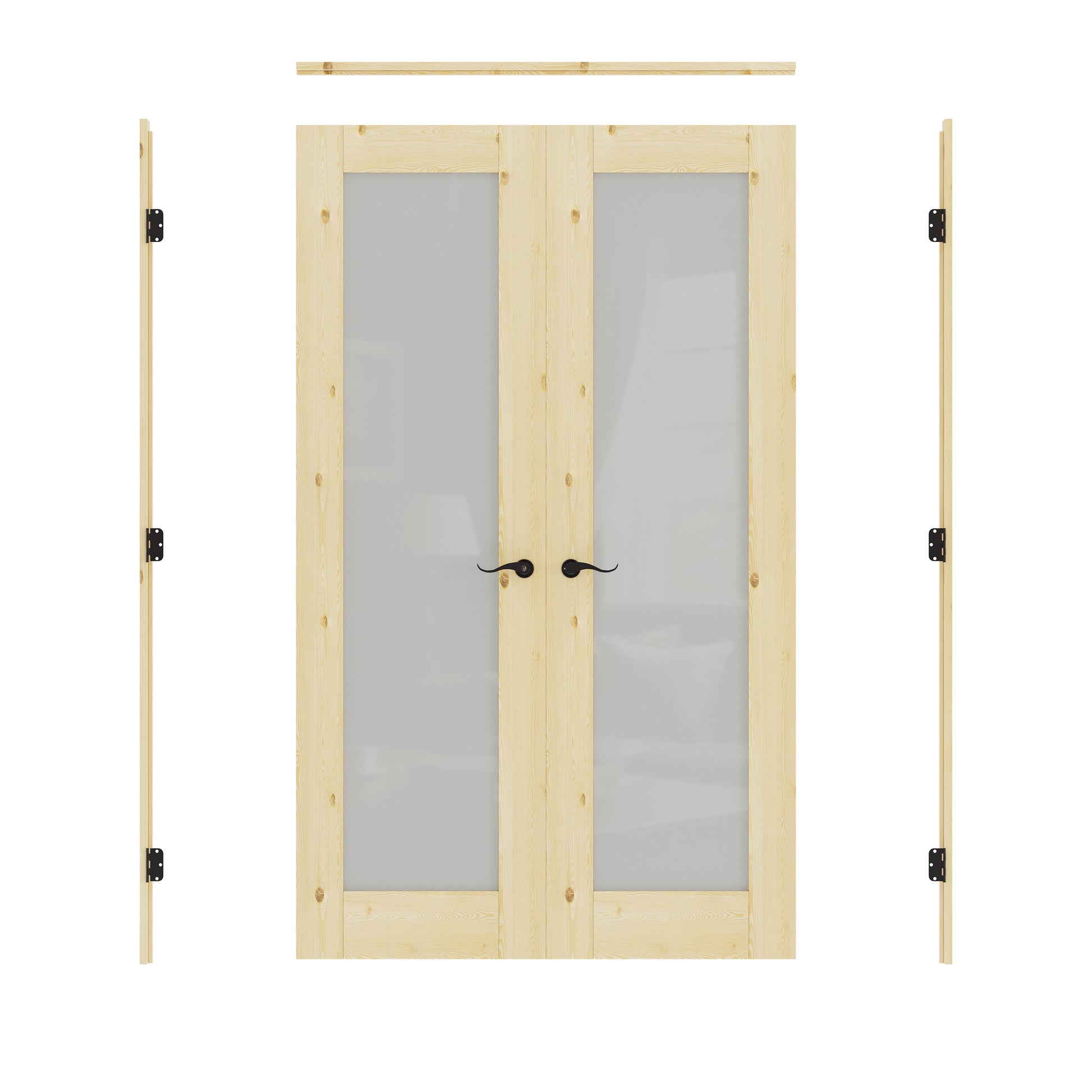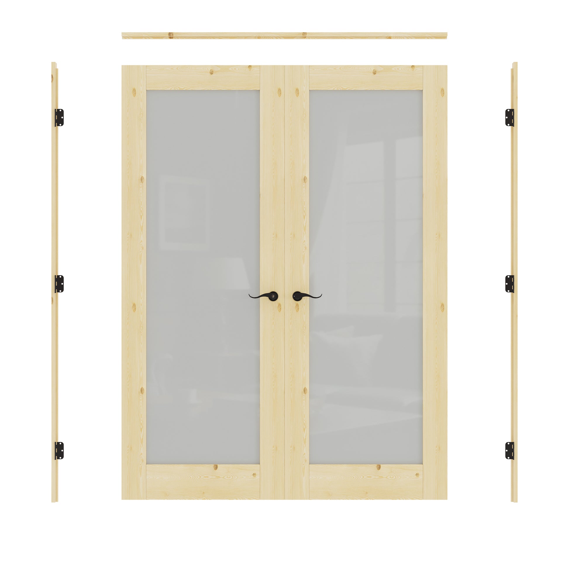 JUJUBON Prehung French Door, Tempered Frosted Glass & Pine Wood Door Slabs with Jamb, Black Hinges, 4 Levers & Latch, Solid Core Interior Doors, Unfinished Double Doors Interior