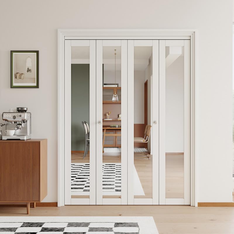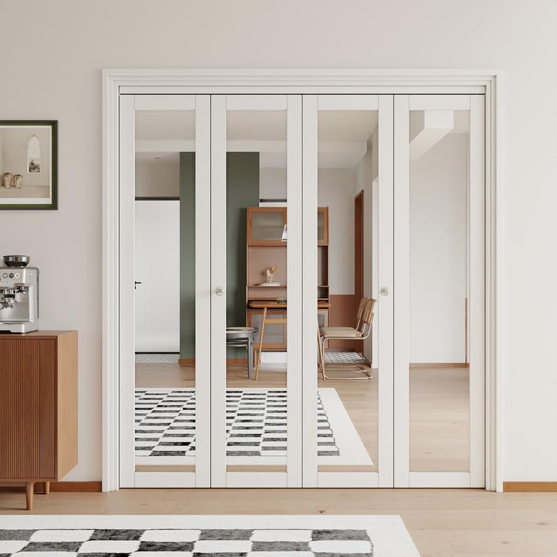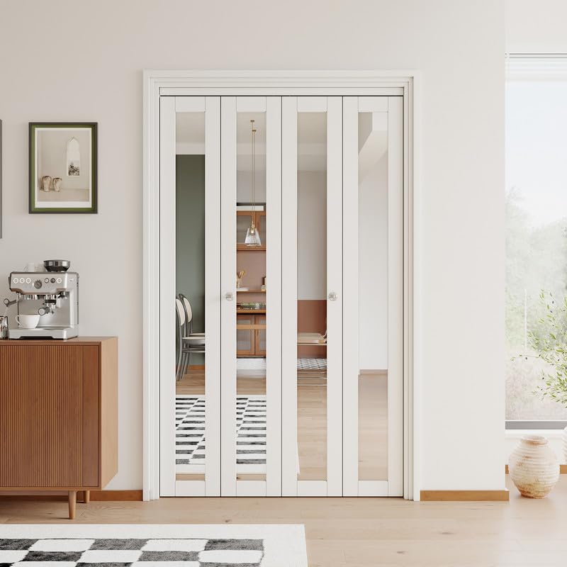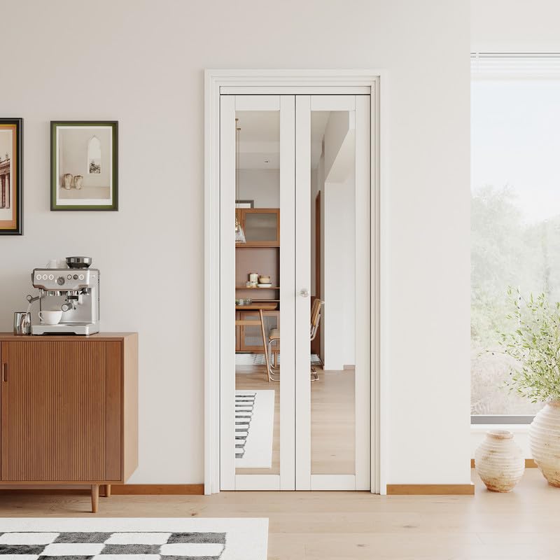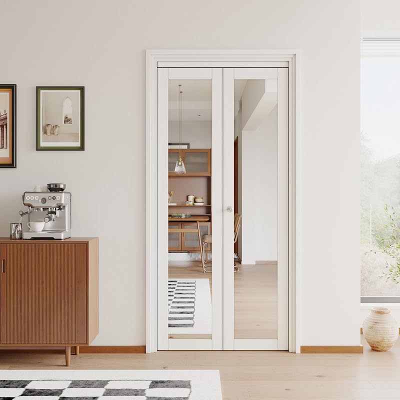 PREMIUM BIFOLD DOOR: The wooden part of this folding door is made of engineered wood for safety and durability, with PVC film attached to the surface, which is scratch-resistant, waterproof, and sturdy, suitable for family with furry friends. Using high-definition mirror material creates an illusion of space, enhancing the vibrancy of your home.