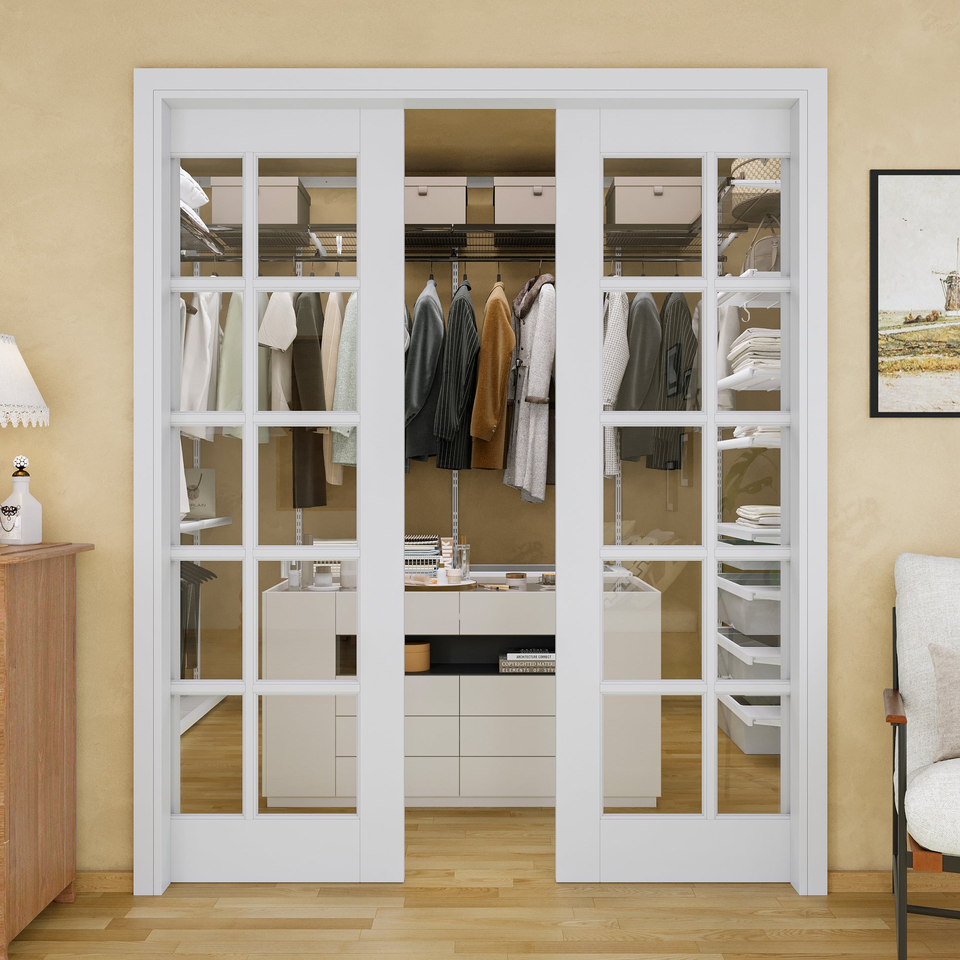 JUJUBON Soft-Close Sliding Pocket Doors, 10-Lite Tempered Clear Glass Door Slab with Hardware Kit&Pocket Door Frame, Interior Sliding Doors for 2x4 Stud, Pre-Finished&Paintable