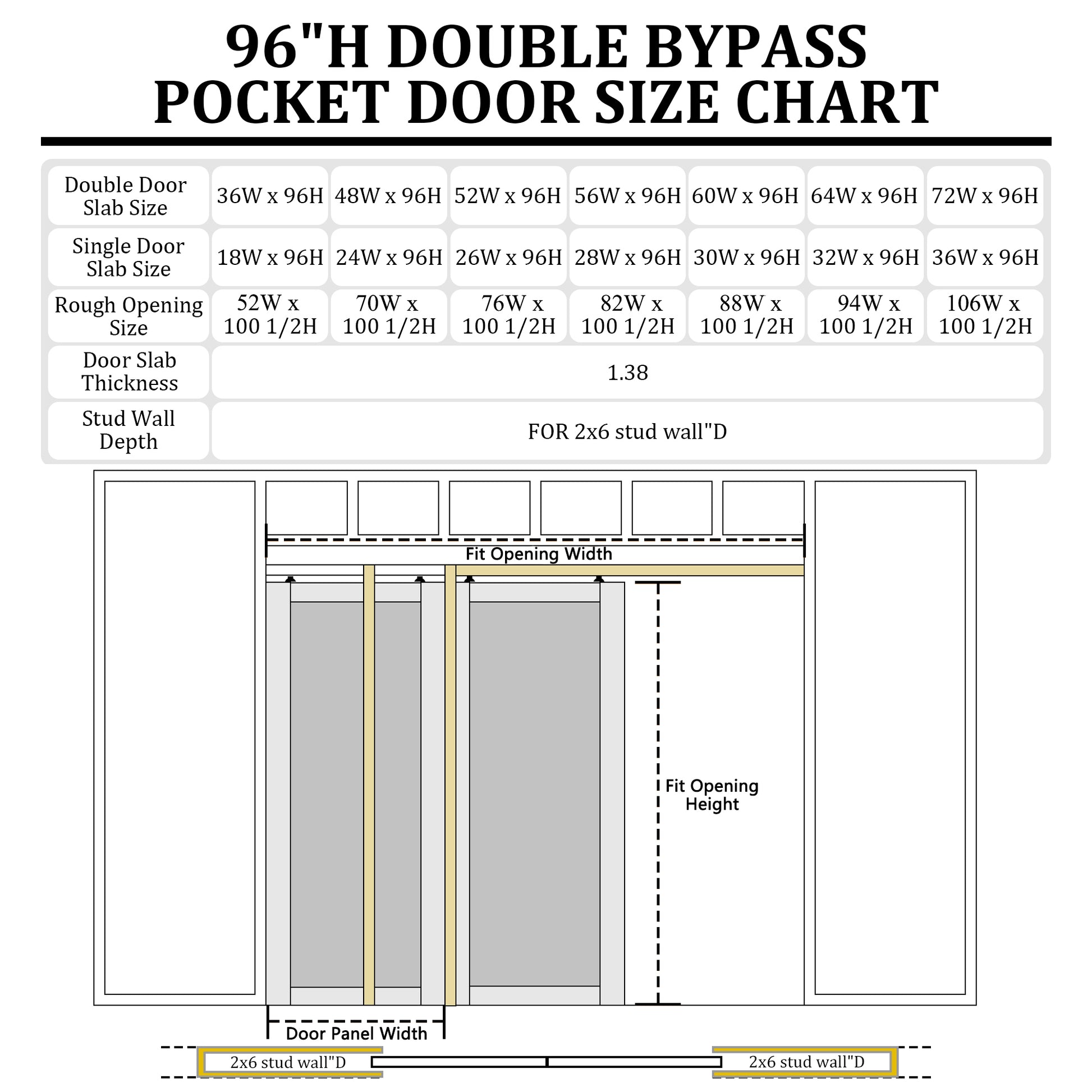 Door Size: Double Bypass Pocket Door Slab Sizes include 36"/48"/52"/56"/60"/64" x 80", with corresponding Single Door Slab Sizes. All doors have a 1.38-inch thickness, designed for 2x6 stud walls, and the chart’s diagram shows fit opening width/height and door panel width for proper installation in the pocket system.