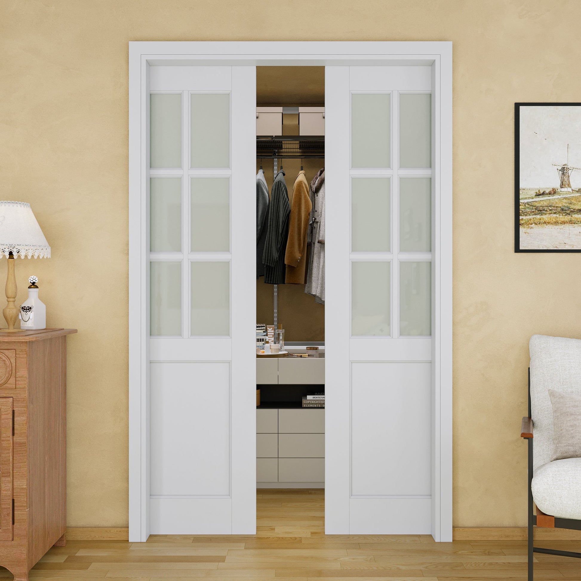 Jujubon 6-Lite Frosted Glass Pocket Door with Hardware Kit & Soft Close & Frame, MDF Wood & Paint-grade Finished, White