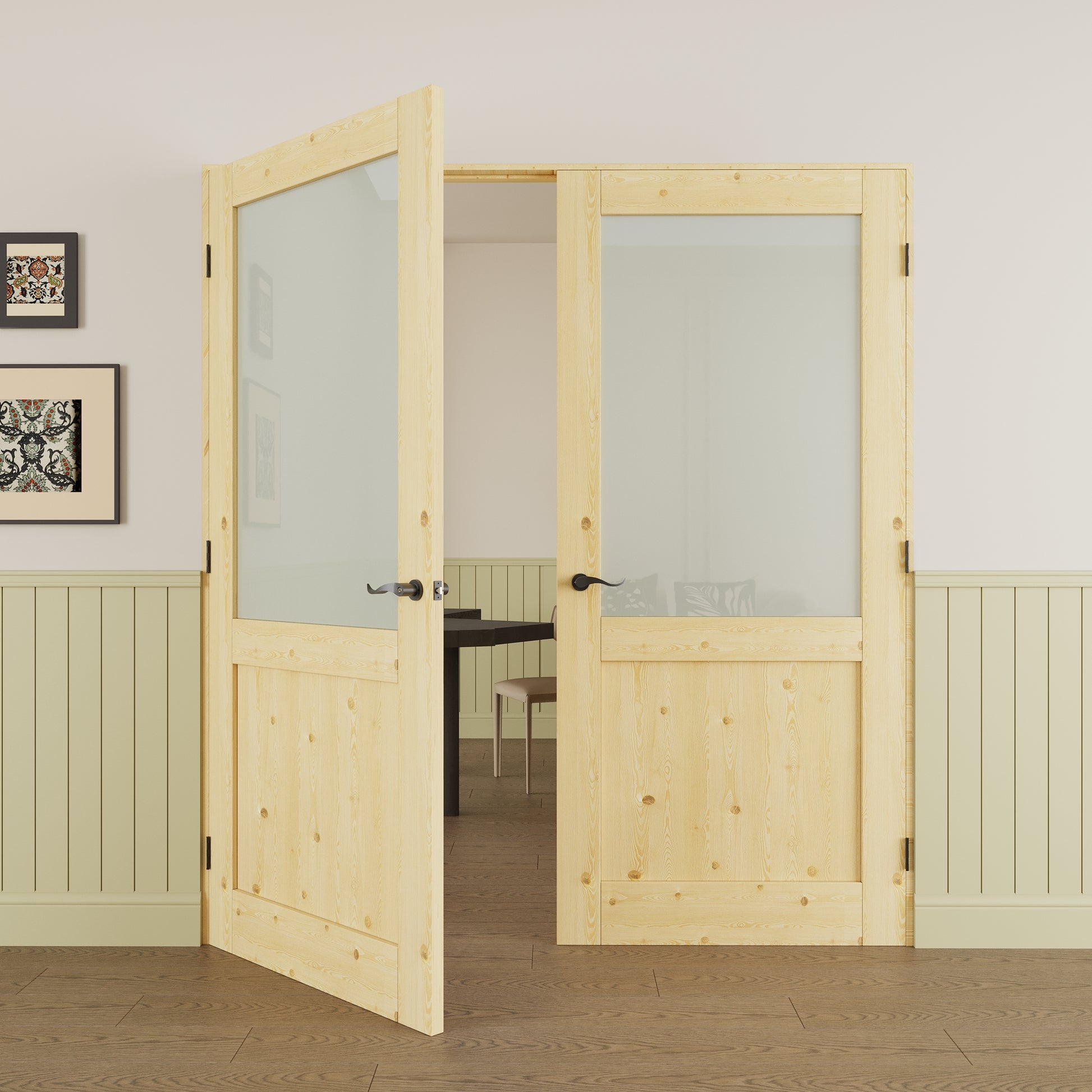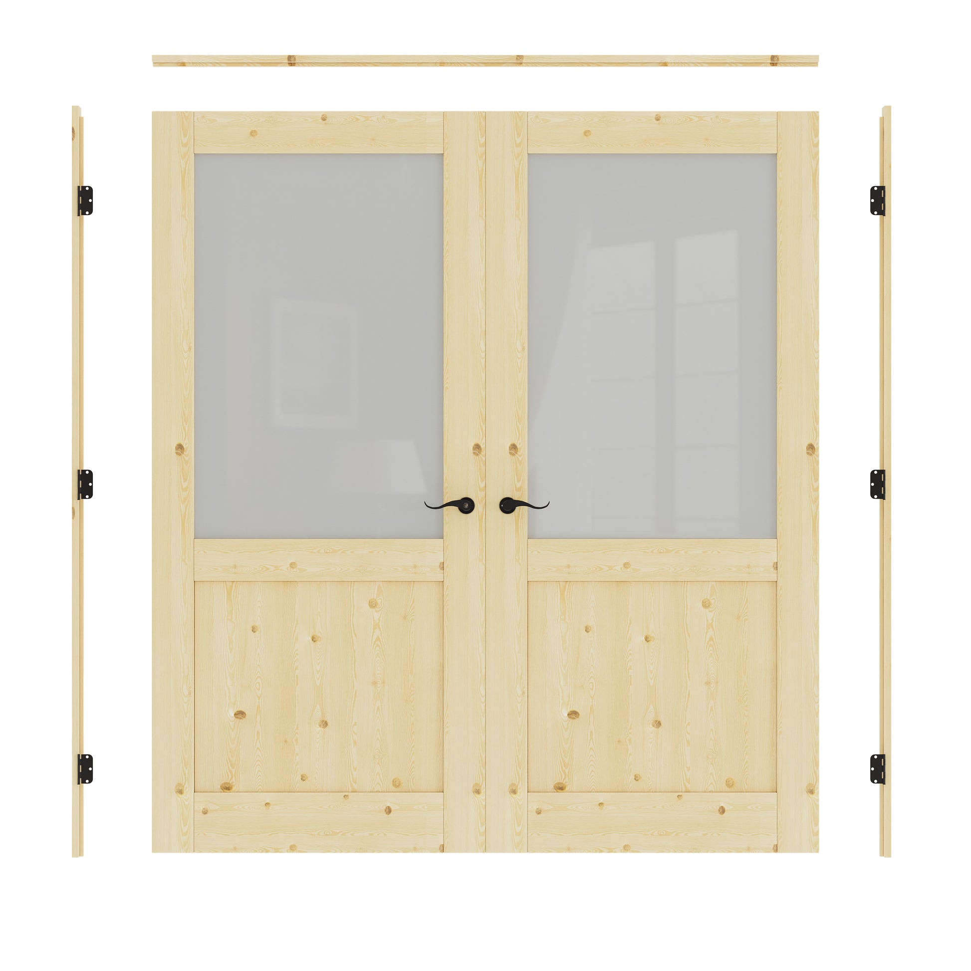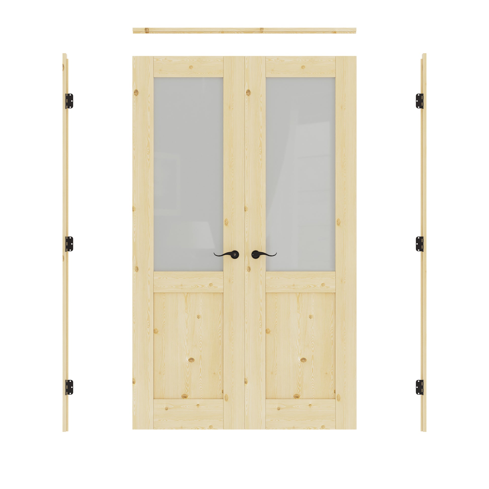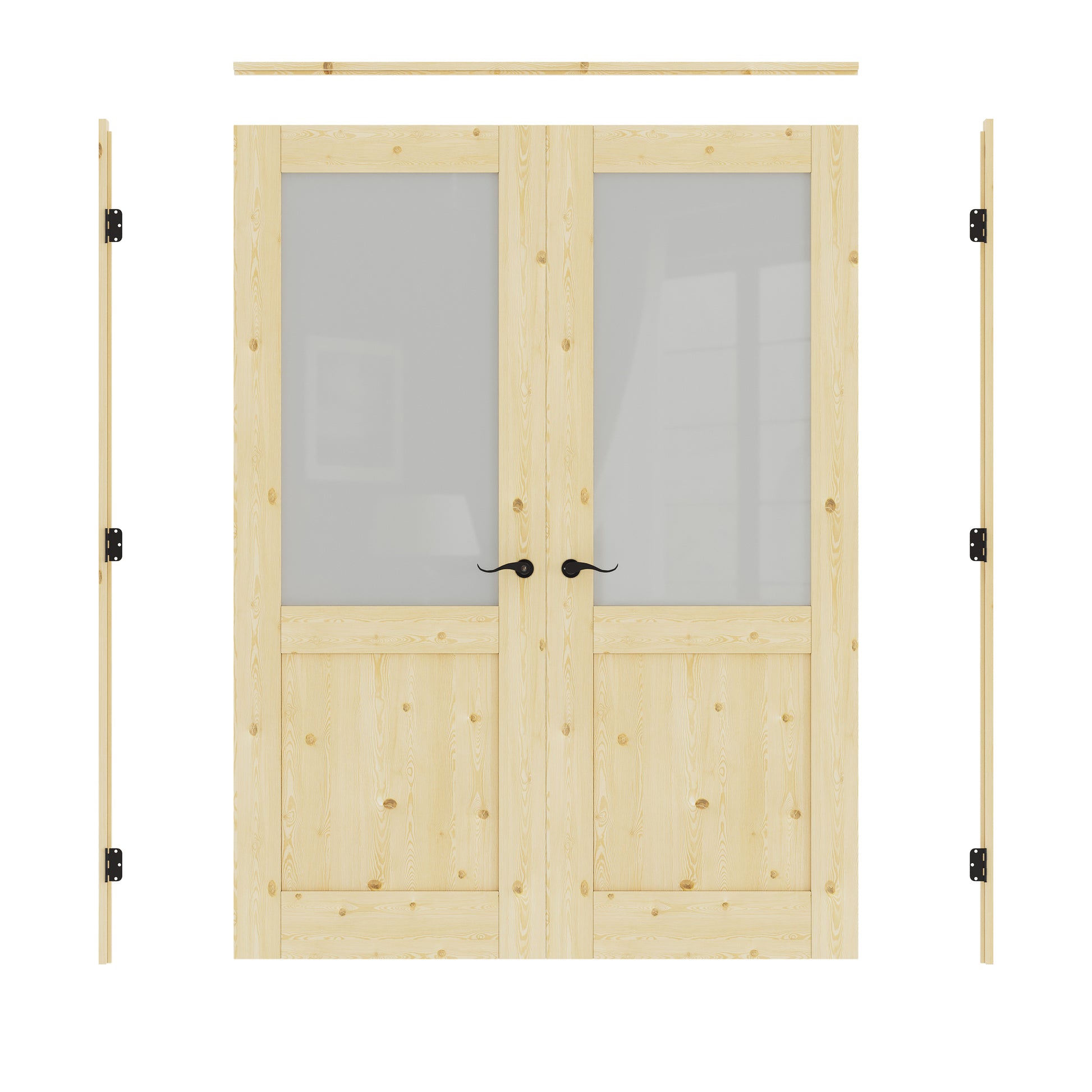 JUJUBON Prehung French Door, Half Tempered Frosted Glass & Pine Wood Door Slabs with Jamb, Black Hinges, 4 Levers & Latch, Solid Core Interior Doors, Unfinished Double Doors Interior