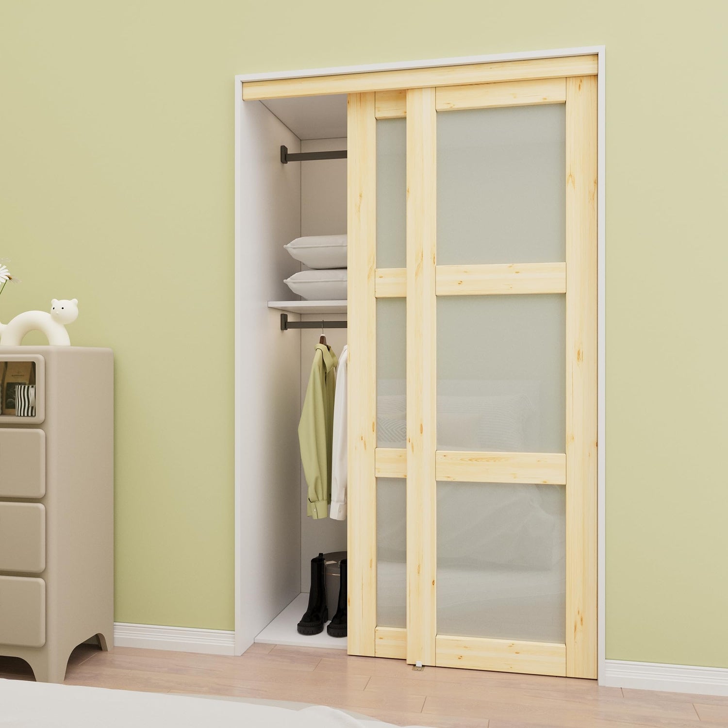 Paintable Sliding Closet Door, 3-Lite Frosted Glass Door with Hardware Kit & Matching Fascia, Bypass Interior Door, Solid Core Pine Wood & Paintable, Unfinished, Easy to Install, Pine Wood