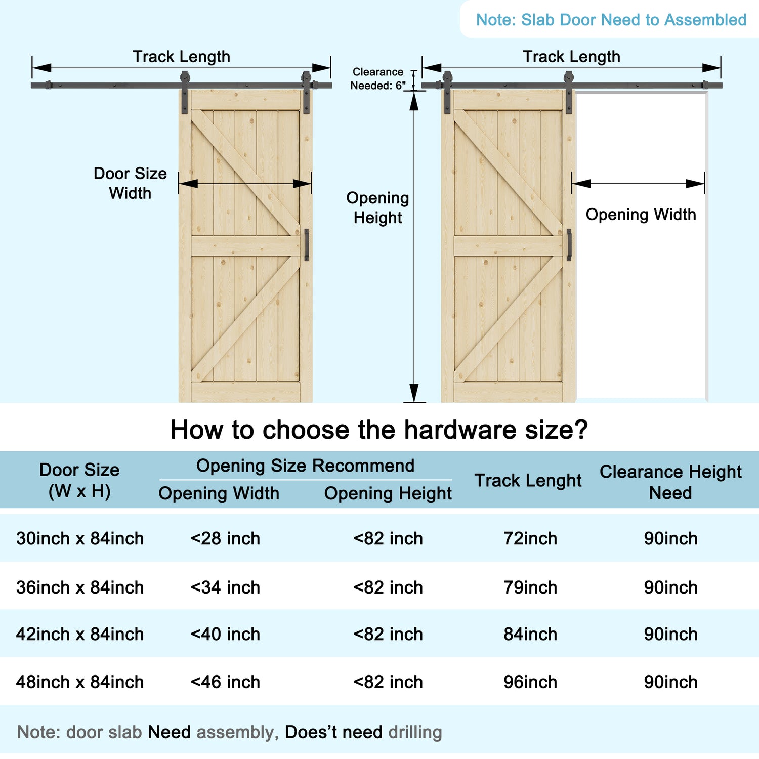 Door slab size of 30"/36"/42"/48" x 84" refer to size guide in pictures above for more details. JUJUBON also offer double barn door products for large opening.