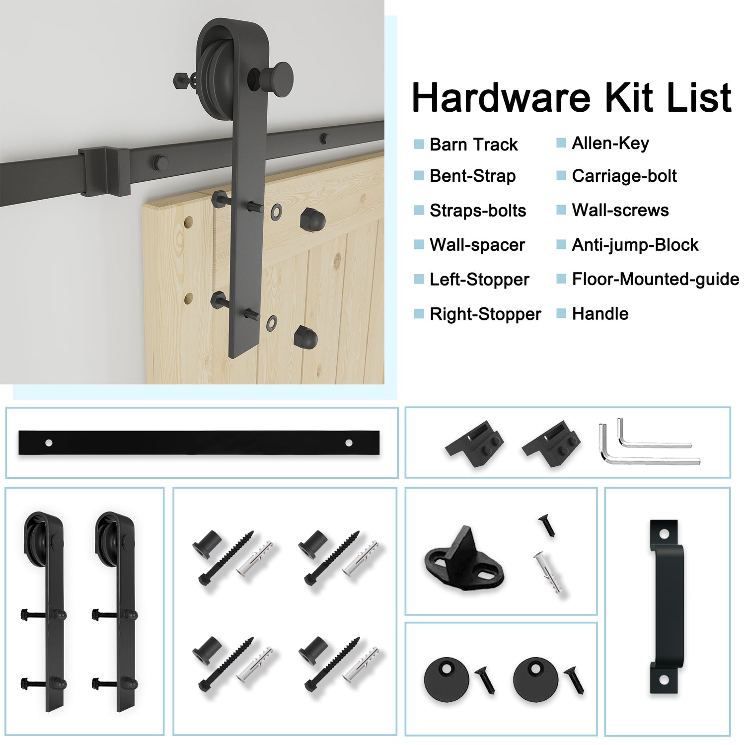 All necessary hardware included: 1 full barn door hardware set, 1 handle & 1 floor guide.Barn door hardware passed 100,000 open & close tests, ensuring lifelong usage.