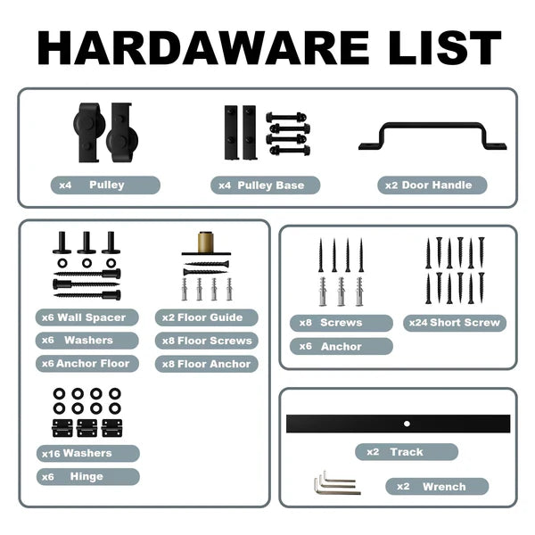 All necessary hardware included: 1 full bifold barn door hardware set, 1 handle & 1 floor guide.Bifold Barn door hardware passed 100,000 open & close tests, ensuring lifelong usage.