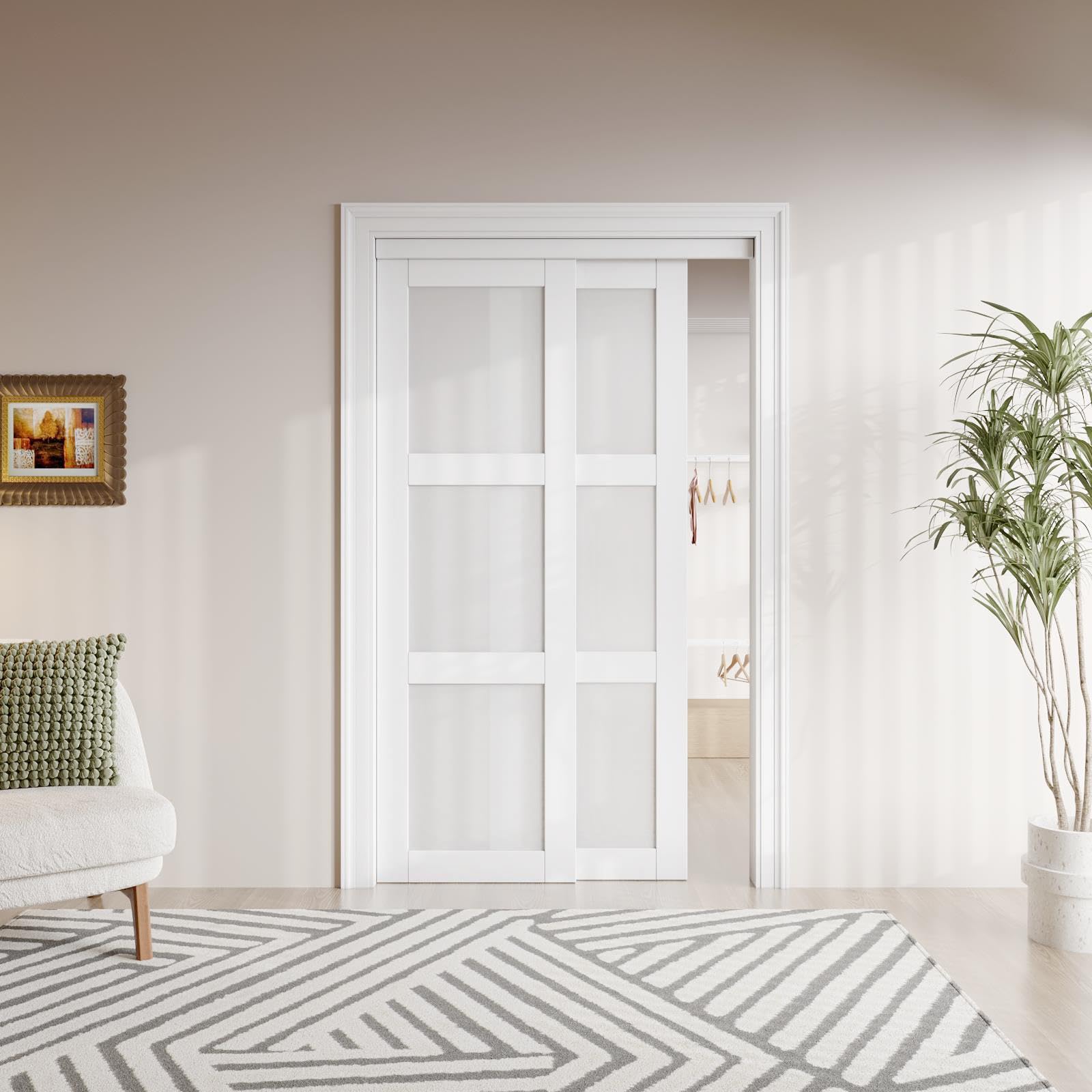 Sliding Closet Door Interior Doors with Hardware Kit & Floor Guide, 3-Lite Tempered Frosted Glass Door Pre-Drilled Easy Install
