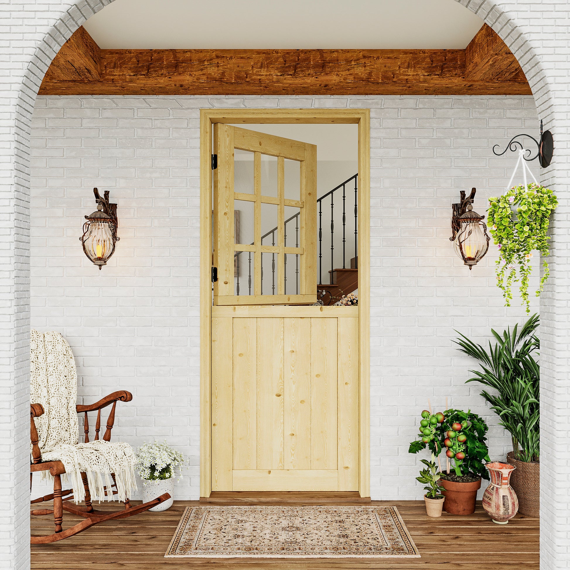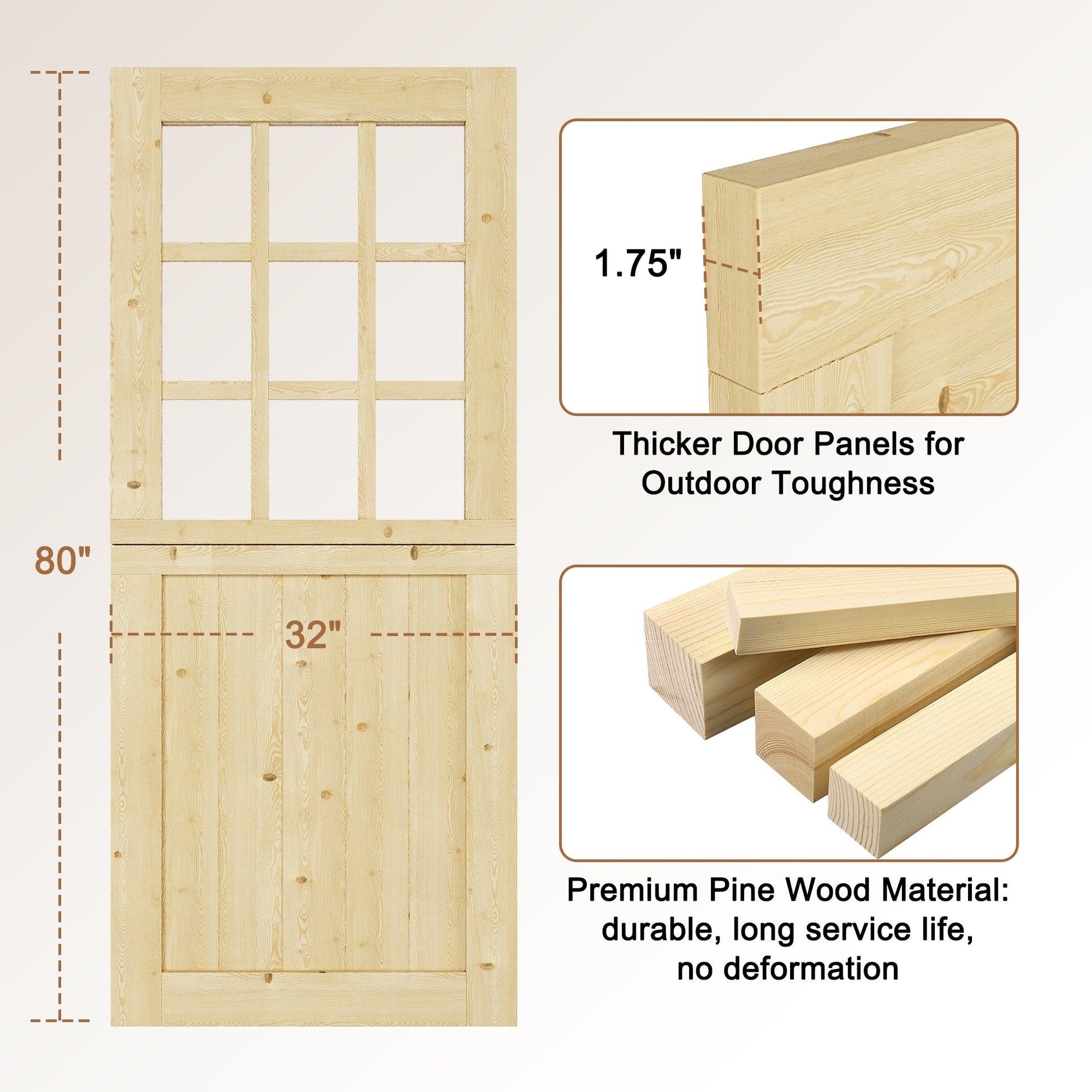 JUJUBON Exterior Prehung Dutch Door, Universal 9 Lite Tempered Clear Glass Split Single Doors, Solid Core Home Entry Door, Natural Pine Wood - with 4 Hinges & 1 Latch & Jamb, Jamb Assembly Needed