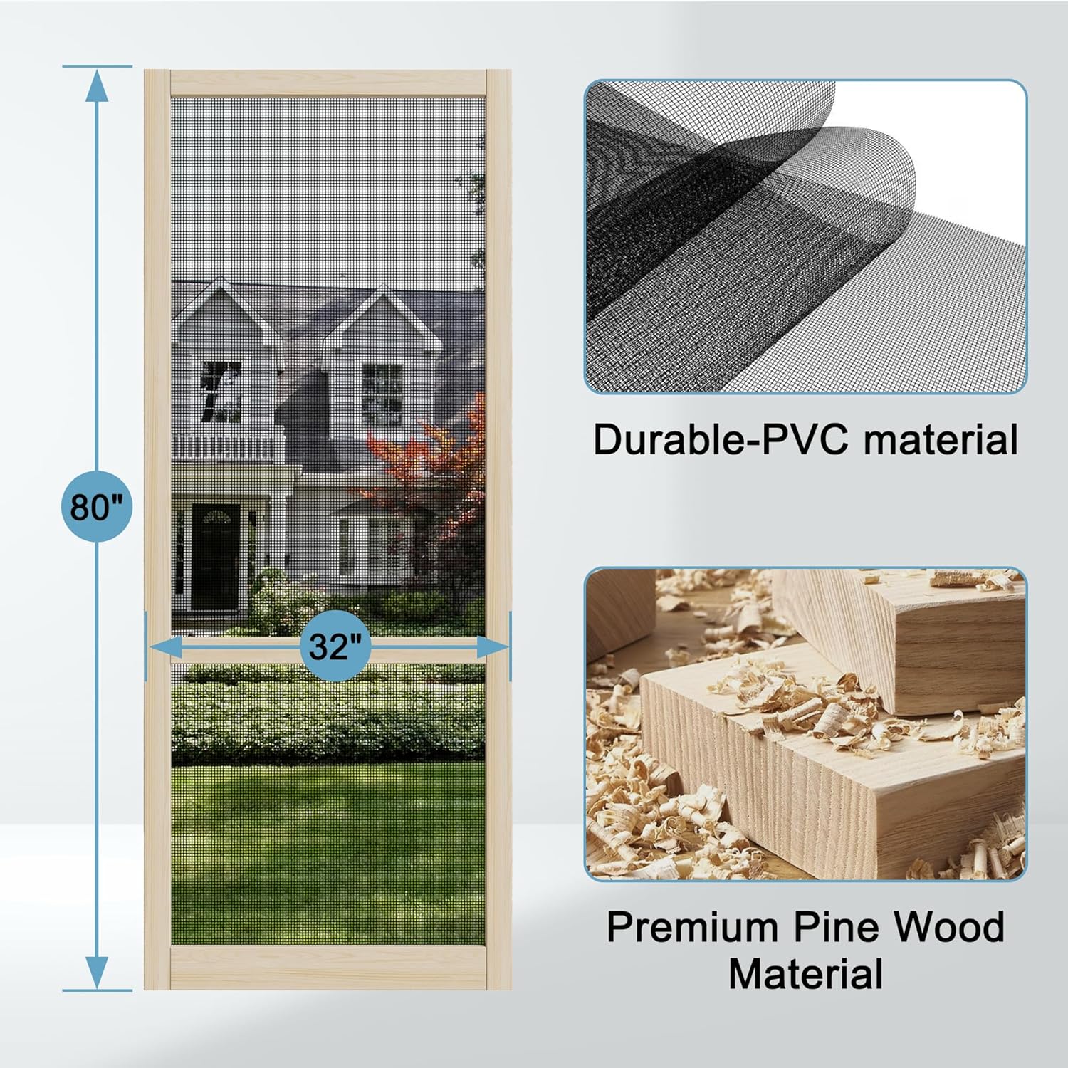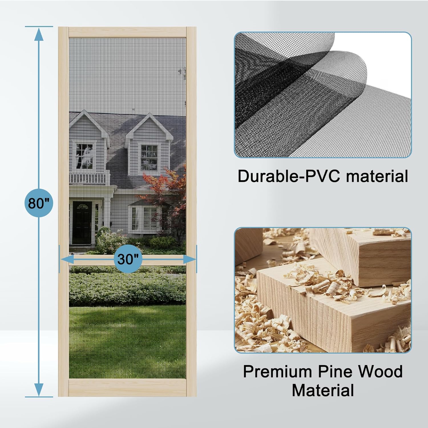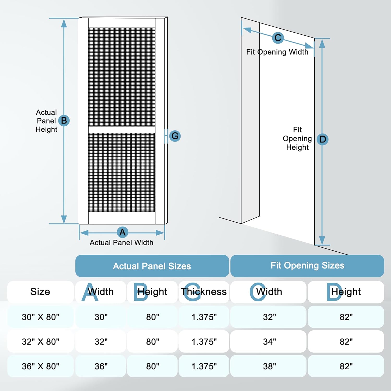【Exact Measurements & Fit Guide】: panel dimensions: 30''/32''/36" W x 80"H x 1.38" thick Wooden Screen Door. Fits door openings measuring 32''/34''/38"W x 82"H - please ensure your doorway is slightly larger than the door slab for proper installation. Pro Tip: Use a tape measure to verify your opening before purchase! For visual reference.