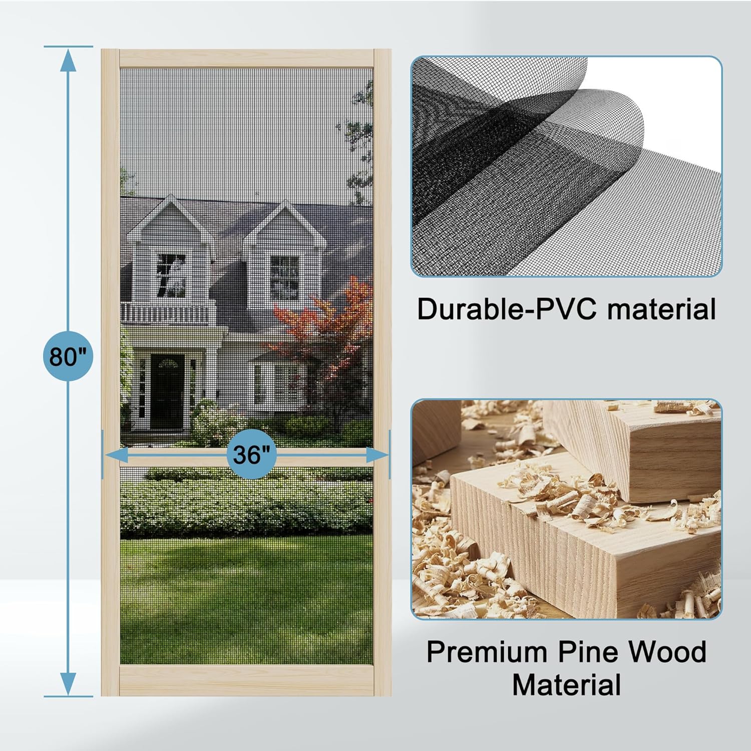 【High-Quality Wood & Durable PVC Mesh Material】: Constructed with FSC-certified solid pine wood (Front Door Screen) and tear-resistant PVC-coated mesh, this durable screen withstands daily use keeps Creatures out. The specially treated mesh maintains its integrity even with prolonged sun exposure.